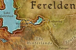 North of the property, on yet another elevation, rests the remnants of an abandoned watchtower. With caution, it can still be explored. It offers a 360° view of surrounding vistas including Redcliffe to the west, much of the Hinterlands to the south, Kinloch Hold across the lake to the north, and a hint of Lothering to the east.
